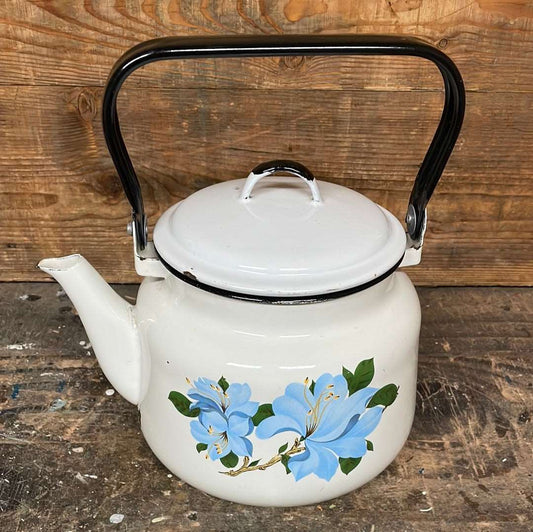 This item is sold out, please contact us for alternative products.Vintage enamel kettle white with floral decor 3 litre.