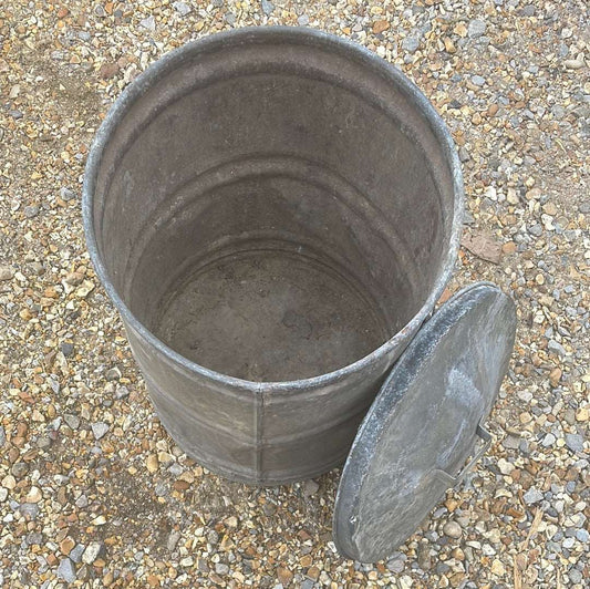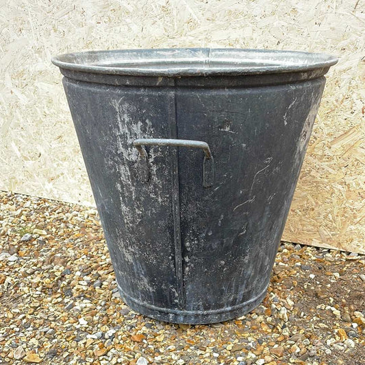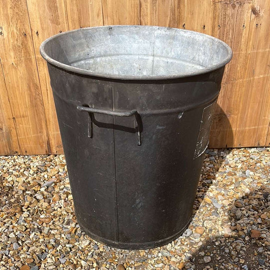 Tapered sided rustic galvanised two handled bin garden planter aged black paint.